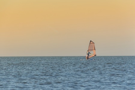 Seascape of still sea surface, man practicing wind surfing and golden sunset in sky on summer clear day. Still landscapes of travels and destination scenics