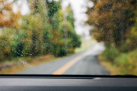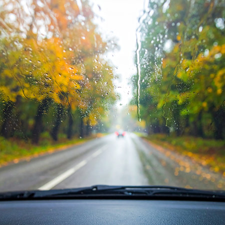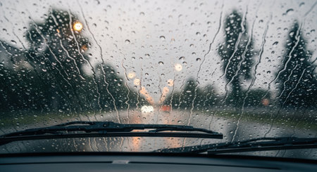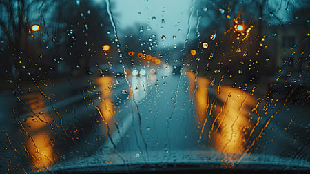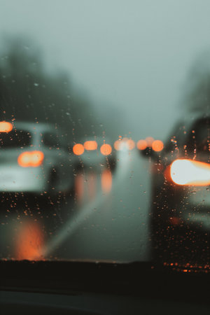 Experience the essence of a rainy journey with our blurred view of a road through a wet car window. Stay safe on wet roads