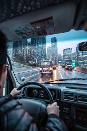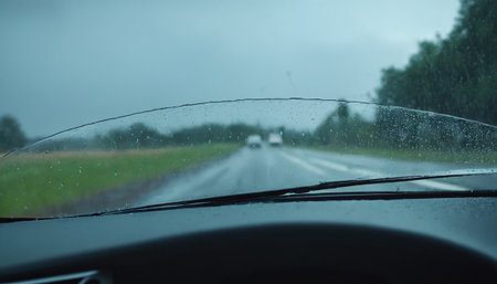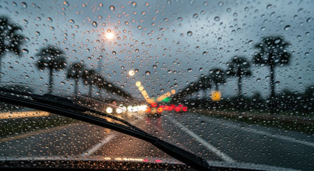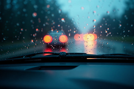 Raindrops cover a car's windshield creating a blurred view of a road and other cars, conveying a feeling of weather. Perfect for depicting driving safety in wet conditions or atmospheric travel content.