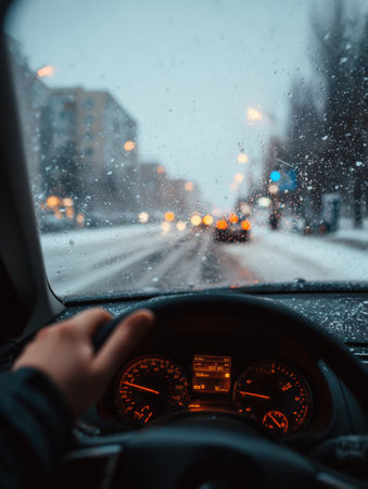 Driver prepares to navigate a snowy city street as dashboard lights illuminate the interior amid falling snowflakes.