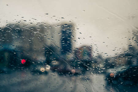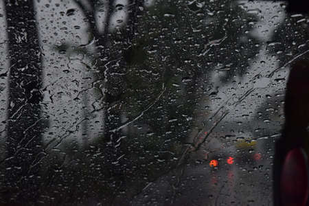 Driving in raining. Rain on car windshield or car window in rainy season and blurry traffic road in background. Rain drops on car mirror. Road in rain. Drizzle raining decreases driving visibility.