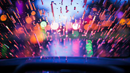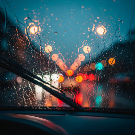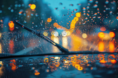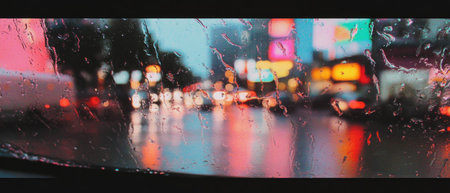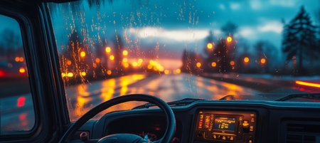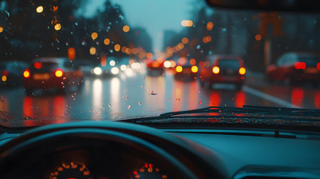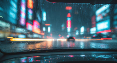 Rain creates a blurred effect on the windshield, revealing colorful lights of the city at night. The atmosphere is moody, reflecting a typical rainy evening scene.