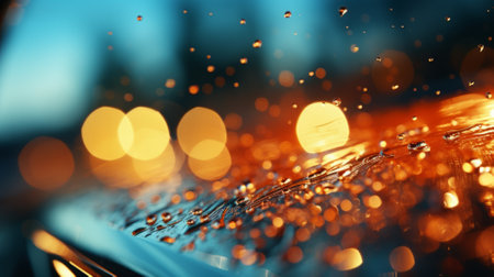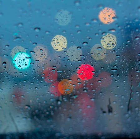 Window city lights rain drops, Bokhe abstract background autumn winter glow glass. Selective focus.