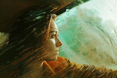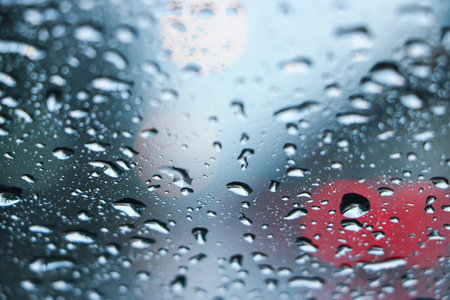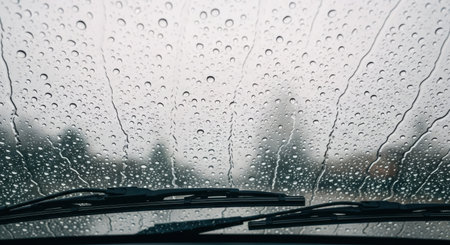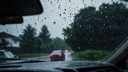 POV from Car Window on Rainy Day with Water Droplets and Blurred Background