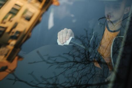 Man clean steering wheel using wet wipes. Man protect himself and clean car inside using antiseptic