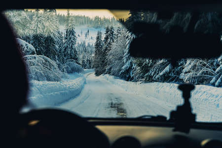 Diving on a snowy road through a winter wonderland. Drivers point of view. High quality photo