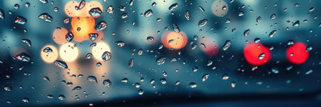 Traffic lights captured through a rainy windshield, adding a cinematic mood to urban driving scenes.