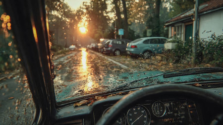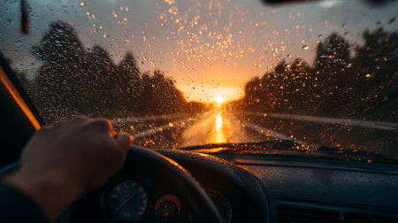 Driving towards a stunning sunset on a rainy evening with reflections on the windshield and vibrant colors filling the sky