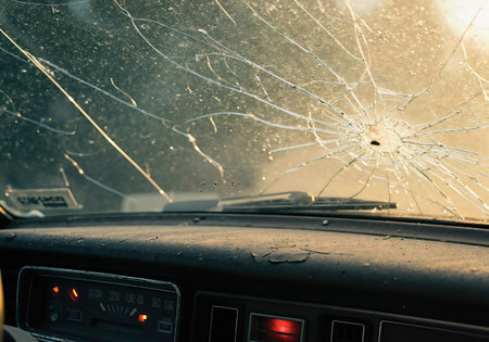 Close up of a shattered windshield on a damaged car, illuminated by sunlight. Concept of car crash, accident, or vehicle breakdown.