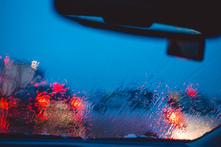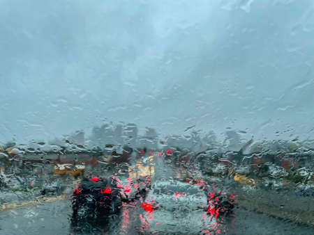 driving car on road in the rain with raindrop over the wind shield, traffic jam in rainy season
