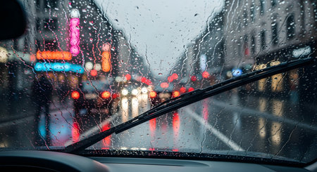 A view from inside a car looking out through a rain-streaked windshield with a wiper blade in motion. Blurred colorful city lights and traffic create a bokeh effect in the background, capturing a moody urban rainy night atmosphere.