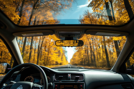 Car driving in Autumn woods with beautiful Fall foliage colors. Autumn seasonal concept. AI generated.