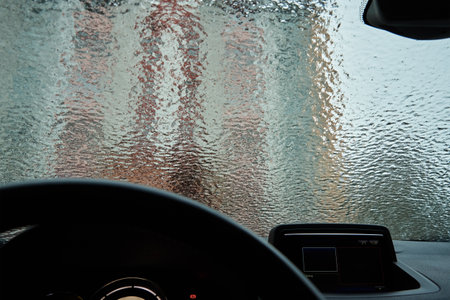 Inside view from car covered in freezing rain. Ice on a car windshield. Extreme winter weather for driving
