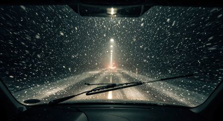 An immersive view from a car's dashboard at night, capturing the intense snowfall reflecting light from the vehicle's headlights on a dimly lit road, emphasizing hazardous weather conditions.