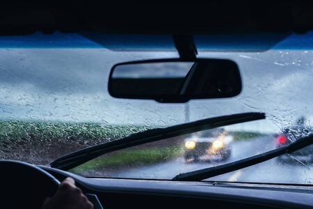 Driving carefully a car on the road on a rainy day, traffic of cars on the road. Windshield of a car wet by the rain, wiper blades cleaning the front window.