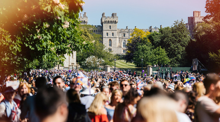 WINDSOR, BERKSHIRE, UNITED KINGDOM - MAY 19, 2018: Thousands in front of Windsor Castle during royal wedding marriage celebration of Prince Harry and actress from Suits Ms Meghan Markle