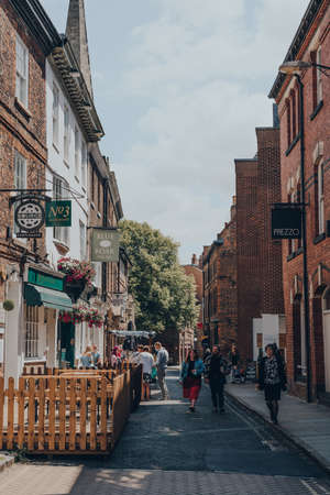 York, UK - June 22, 2021: People walking past restaurants and cafes on a street in York, a walled city in northeast England that was founded by the ancient Romans.