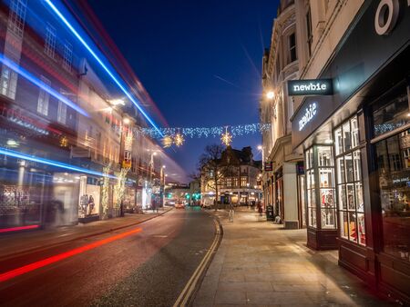 London, England, UK - December 4, 2019: Richmond street decorated with Christmas lights and car traces on the road in winter holiday season at blue hour in the morning