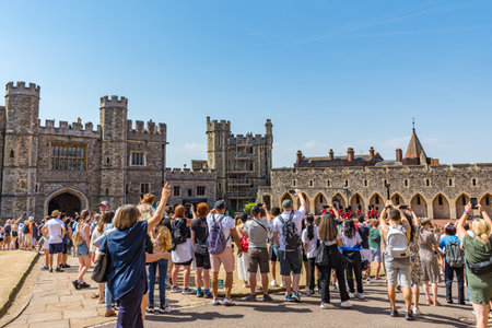 WINDSOR, UK - JUNE 19, 2022: Tourists in the courtyard of the Windsor Castle in Windsor in a sunny summer day, UK