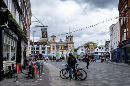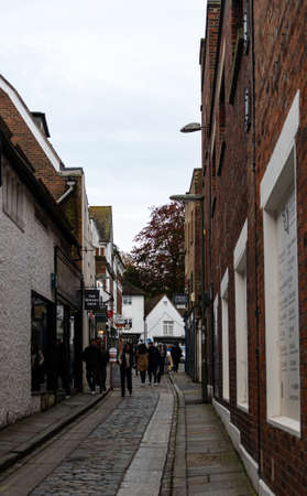 Guildford, United Kingdom - November 06 2019: Shoppers and stores along the tiny side street The Shambles