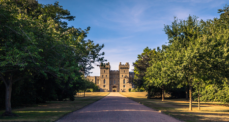 Windsor castle, seen here beyond the long walk, is in Berkshire, England, and was built in the eleventh century and is regularly used by the Royal Family