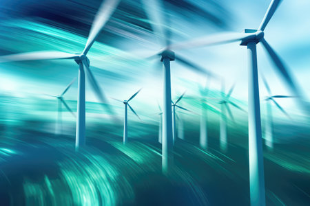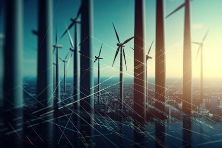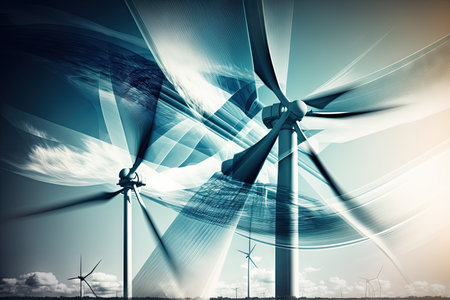 energy industry double exposure of sleek wind turbines, with their blades spinning in the wind, created with generative ai