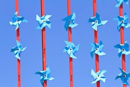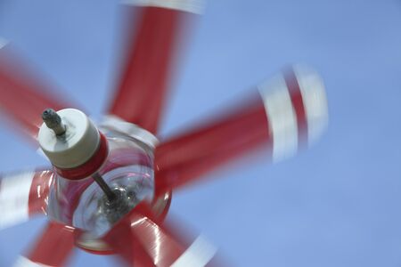 A vibrant spinning wind turbine captured against a bright blue sky, showcasing abstract motion blur, highlighting the importance of renewable energy and sustainability.