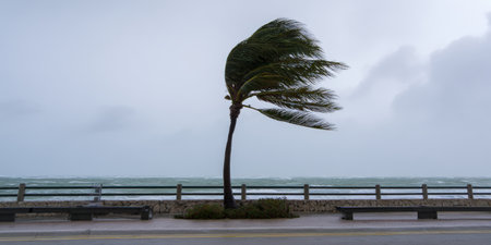 Dramatic gale winds bend palm trees under stormy skies, showcasing the raw intensity and power of tropical storms