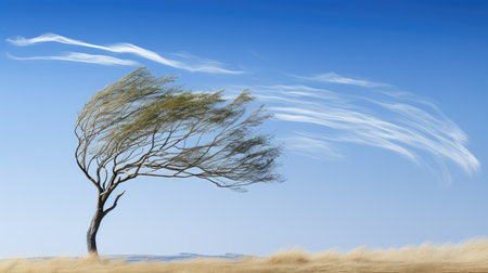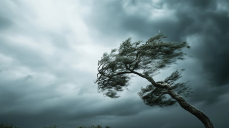 A solitary tree bends dramatically in strong wind against a stormy sky backdrop