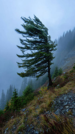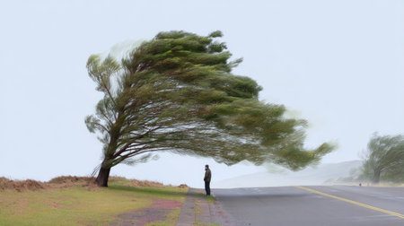 A solitary man contemplates while standing next to a tree dramatically leaning due to strong winds, capturing the essence of nature's power in a serene, foggy setting.