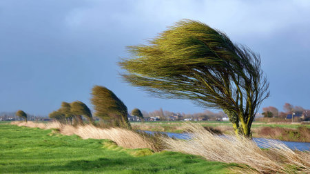 A captivating view of wind-swept trees beside a tranquil riverbank showcases nature's beauty. The serene landscape highlights the resilience of the environment.
