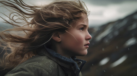 face of a young woman with her hair blowing in the wind, created with generative ai