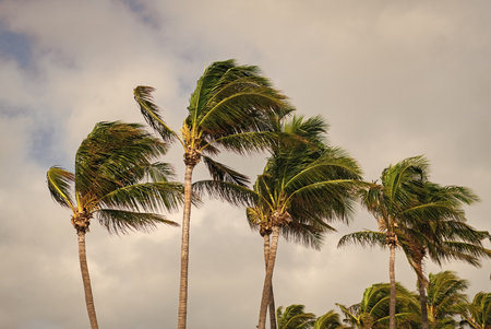 This captivating image showcases vibrant palm trees swaying dramatically in the wind against a stormy sky, capturing the power of nature.