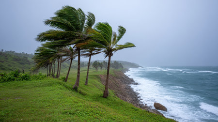 A stunning coastal scene featuring swaying palm trees amidst a stormy atmosphere, turbulent ocean waves crash against the rocky shoreline; a reflection of nature's raw beauty.