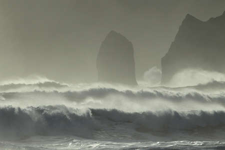 waves breaking on Renisfjara beach in front of the Reynisdrangar basalt sea stacks, southern Iceland