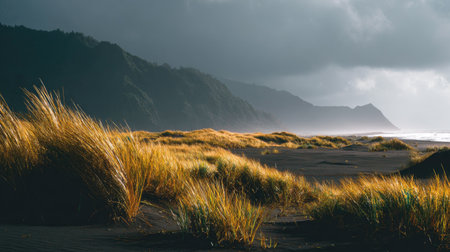 A scenic coastal landscape features golden-hued dunes in the foreground, contrasted by a dark, moody sky. The composition emphasizes natural elements, with mountains in the background and a suggestion of the sea. The lighting is diffused, giving a sense of atmosphere. Suitable for environmental themes and scenic backgrounds.