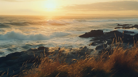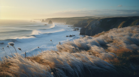 a stunning uhd image captures the windfall grasses gracefully swaying over the ocean. this layered and atmospheric landscape showcases golden light illuminating the scene, creating an epic and captivating view. the combination of light indigo and white hues adds a touch of serenity to this british topographical masterpiece. ai generated
