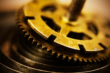 Copper gears background. Aged mechanical clock wheels close-up. Shallow depth of field.