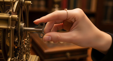 A close-up of a woman's hand using a vintage-style winding key to turn the gear of an intricate brass mechanism, such as an old clock or music box. The warm, soft lighting and nostalgic atmosphere represent starting, tradition, or maintaining something of value.