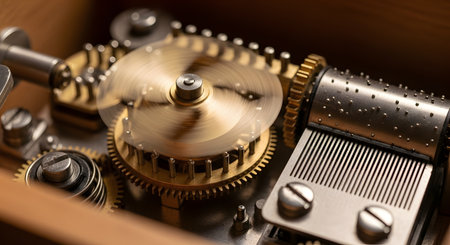 A detailed macro shot reveals the inner workings of an antique music box. The image focuses on the pinned metal cylinder and the steel comb that plucks the tines to create a melody, surrounded by intricate gears. This represents nostalgia, mechanical music, precision engineering, and classic craftsmanship.