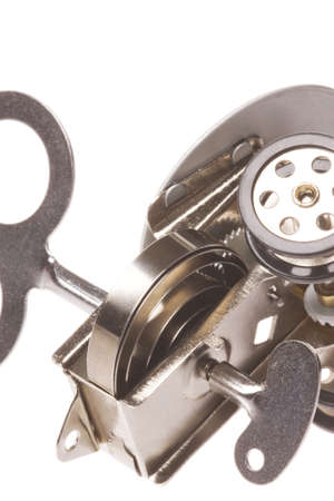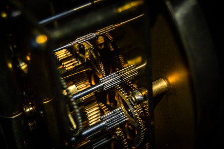 Close up of old vintage mechanical clockwork machine. Retro background.