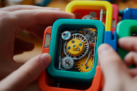 Hands delicately assemble a vibrant mechanical box filled with intricate gears and cogs. The warm atmosphere of the workshop inspires creativity and innovation in this captivating project.