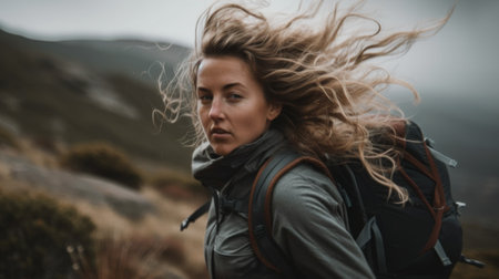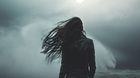 Woman long hair blowing in wind stands against stormy backdrop image, ai generated. Female leather jacket amidst turbulent weather photography scene wallpaper. Resilience concept photorealistic photo