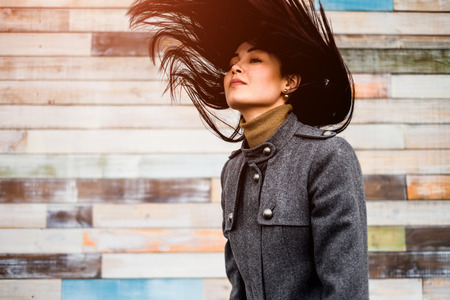 single sweet girl smiling with her long black hair blowing upward looks at camera