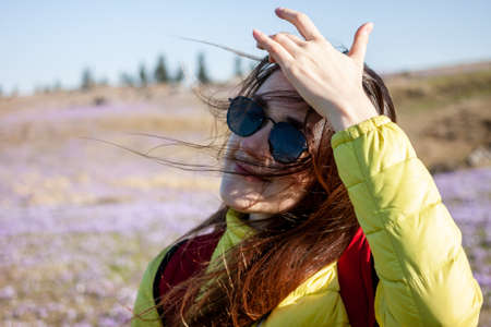 Closeup of young woman face covered with flying hair in windy day standing at mountain
