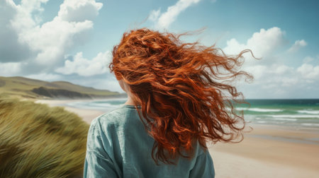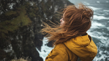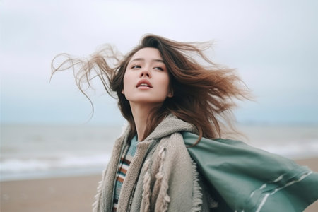 Confident woman on a wild beach, with windblown hair and a strong stance, embracing the power of nature