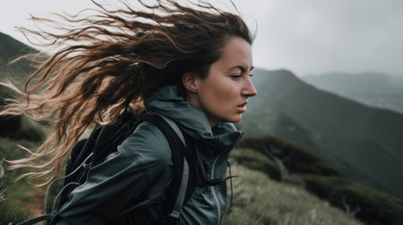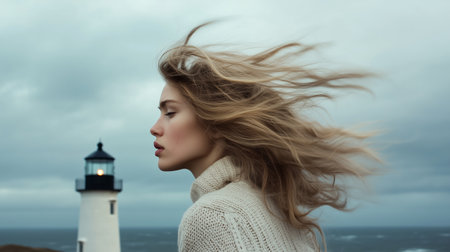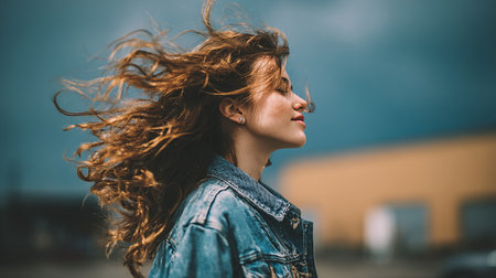 A woman with her hair blowing in the wind. Generative AI image.