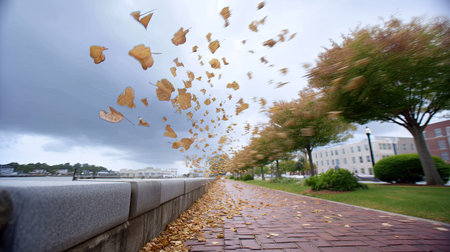 A captivating autumn scene showcasing leaves being swept along a pathway under a dramatic cloudy sky. The vibrant colors and wet ground create a serene atmosphere.