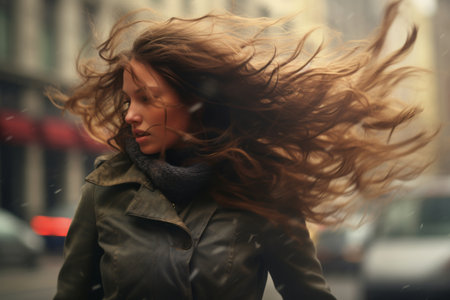 Beautiful young woman withstanding strong wind on rainy day in a city street. Windy weather. Generative AI.
