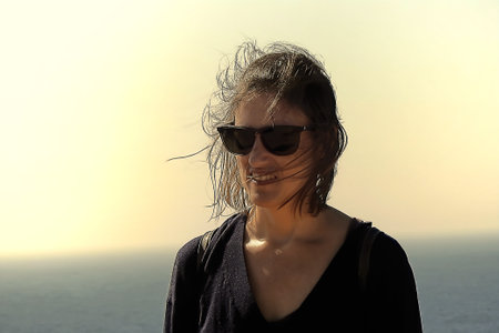 Girl with windblown hair looking at camera during sunset by the sea on a windy day